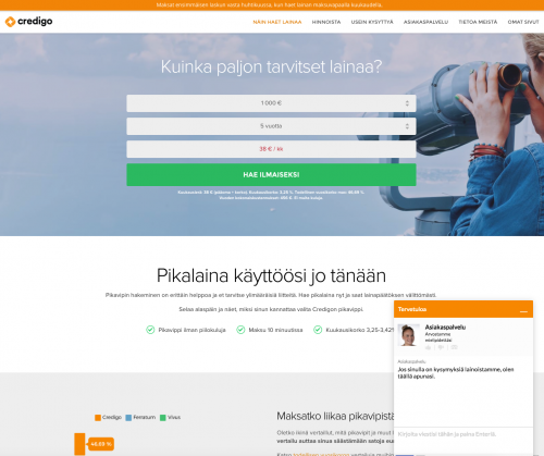Credigon asiakaspalvelu palvelee lainan hakemisesta kiinnostuneita asiakkaita jo ennen kuin tämä on rekisteröitynyt verkkosivuilla. Credigon sivuston oikeaan alanurkkaan aukeaa chat –ikkuna josta saa välittömän yhteyden asiakaspalveluun. Ikkunan kautta voi myös jättää välitöntä asiakaspalautetta – vaihtoehtoina ovat pystypeukku sekä peukku alaspäin. Pieni kirjekuori-ikoni ohjaa mahdollista asiakasta lähettämään myös sähköpostia jos se tuntuu itselle luontevimmalta tavalta kommunikoida asiakaspalvelun kanssa. Mielestämme Credigo ansaitsee erityiskiitoksen tämän chat –ikkunan puolesta – tämä on toimiva ratkaisu joka varmasti auttaa kiireisiä lainan hakijoita helppoudellaan.