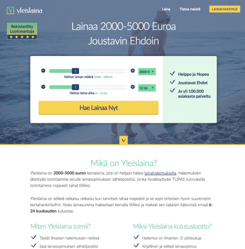 Mikä on Yleislaina? Yleislaina on yksityishenkilöille suunnattu kertalaina jota haetaan netissä. Lainaa varten ei tarvitse antaa vakuuksia, kuten usein pankille annetaan. Yleislaina on ehtinyt palvella jo yli 100.000 tyytyväistä asiakasta verkossa.
